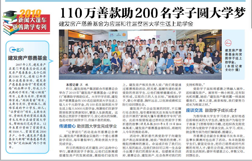 本次捐助活動得到了廈門日報社的關(guān)注, 2019年8月27日A12版報道了本次活動。