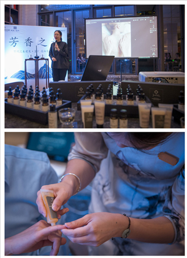 精油的淡雅清香讓人仿佛置身于花田之間,清甜芳香里夾雜著檸檬香調(diào),牢牢地抓住了盛夏清新的精髓。在現(xiàn)場,從泰國遠(yuǎn)道而來的精油講師為來賓慢品精油的味道、功能和使用方式。茉莉精油可以提振精神、改善皮膚過油、缺水或敏感的情況,玫瑰能改善皮膚干燥恢復(fù)皮膚彈性并促進黑色素分解,柑橘精油含有豐富的維生素C,與橙花和薰衣草精油混搭可以淡化疤痕……每一種都有屬于自己的獨特“性格”。