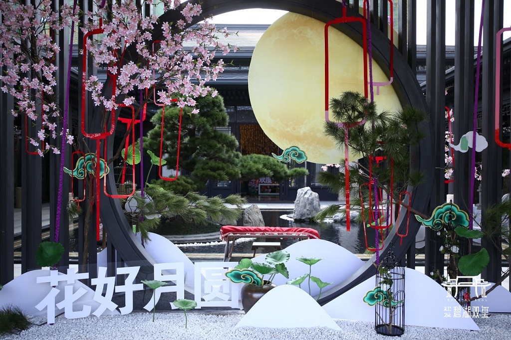 古樸雅致的“花好月圓”入口堆陳、琳瑯滿(mǎn)目的連廊花燈,陳陳箏音在古香古色的碧湖雙璽售樓部悠揚(yáng)回蕩,余音繚繞,仿佛置身古時(shí)的賞燈花節(jié)。靈動(dòng)仙氣的嫦娥使者在門(mén)口歡快地迎接每一位嘉賓。新中式古典奢雅的復(fù)古美陳,玉盤(pán)珍饈和精致花藝的唯美搭配,從細(xì)節(jié)處重現(xiàn)極致的東方神韻,一場(chǎng)奇幻美妙的東方穿越之旅從此開(kāi)啟。