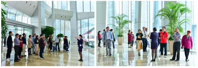大廈大堂內,大廈客服正在熱情地向業(yè)主們介紹建發(fā)集團及其發(fā)展歷史