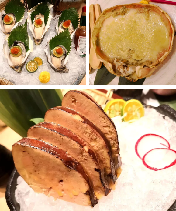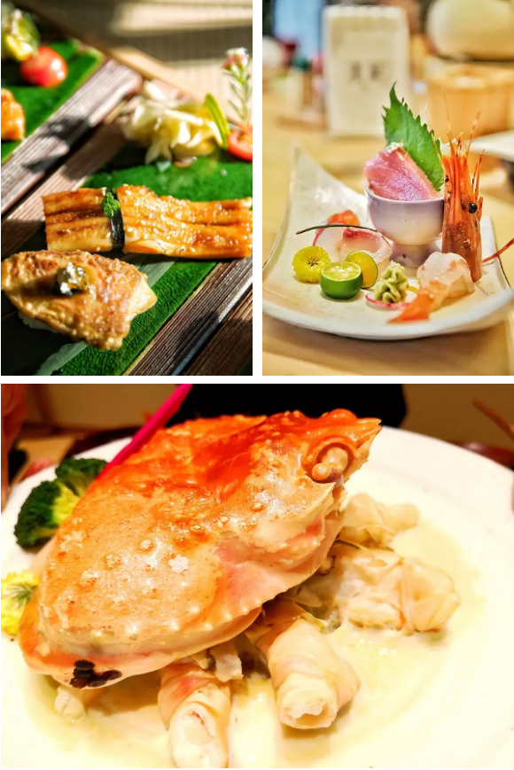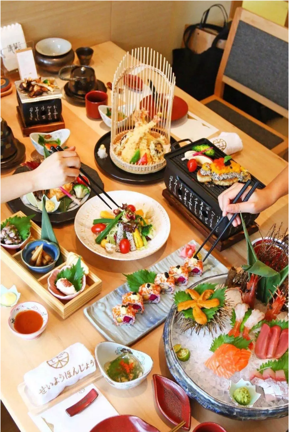 三文魚北極貝刺身雙拼,三文魚厚切大片油脂豐富、北極貝新鮮脆爽;樸葉牛肉,牛肉冒著油花滋滋作響,烤葉子的香氣浸透到肉中,鮮美可口;香煎鵝肝佐鮮果醬,鵝肝煎到金黃酥脆,搭配火龍果和芒果,別有風味;喜歡榴蓮的朋友,可以盡情嘗試一下芝士焗榴蓮,感受榴蓮的香氣四溢、味美不膩。清葉已經(jīng)成為食客們念念不忘的日料店。