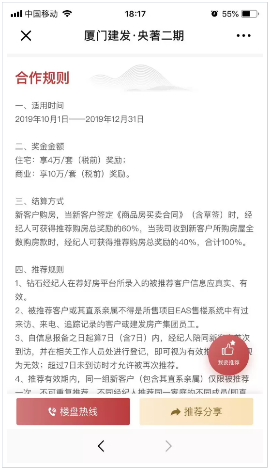說(shuō)明:推薦到訪、成交抽獎(jiǎng)將統(tǒng)一在12月13日進(jìn)行線上抽獎(jiǎng)。推薦傭金以薦好房平臺(tái)各項(xiàng)目公布傭金為準(zhǔn)。