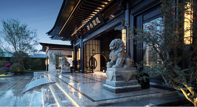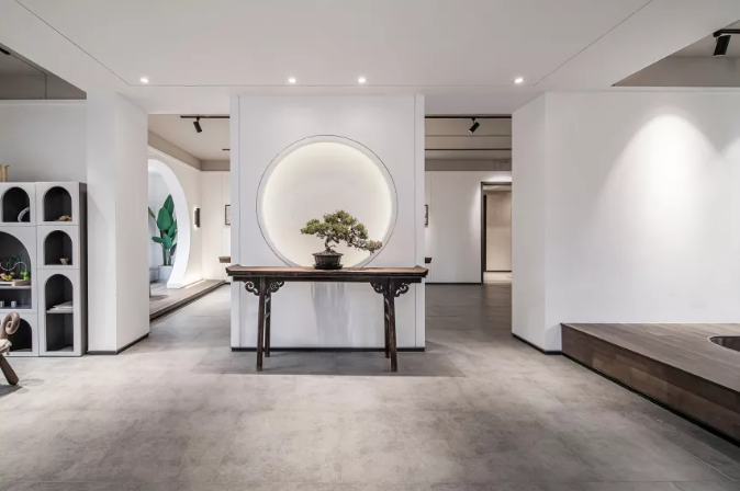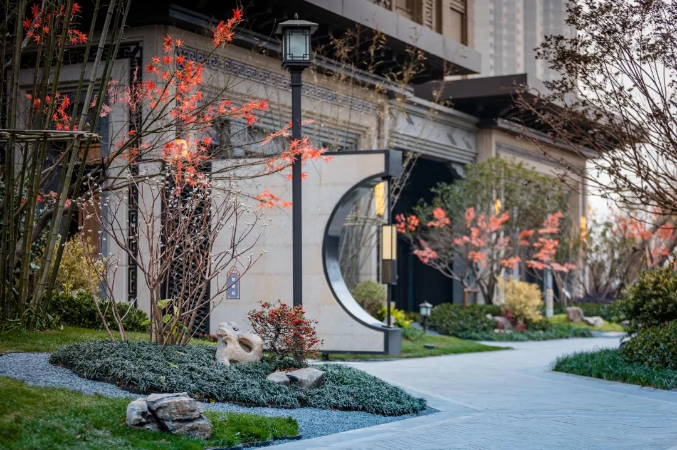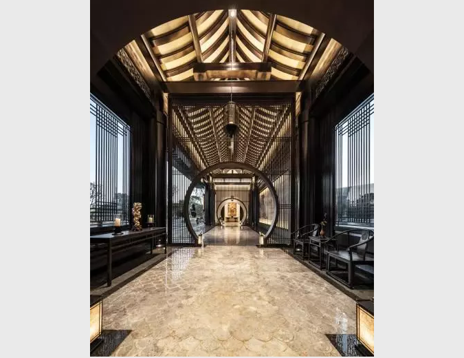 迎賓門以中國傳統(tǒng)的“月門”來規(guī)劃空間,形如滿月、透光而幽靜,在入廊穿月的過程中,產(chǎn)生層層遞進的空間體驗。