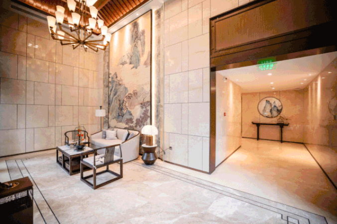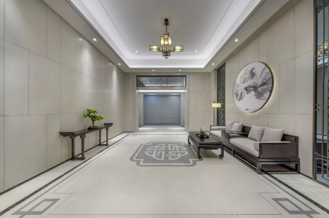 每一個細節(jié)都充滿考究,連電梯的轎廂門廳地面設(shè)計,也采用了中式線條地拼。