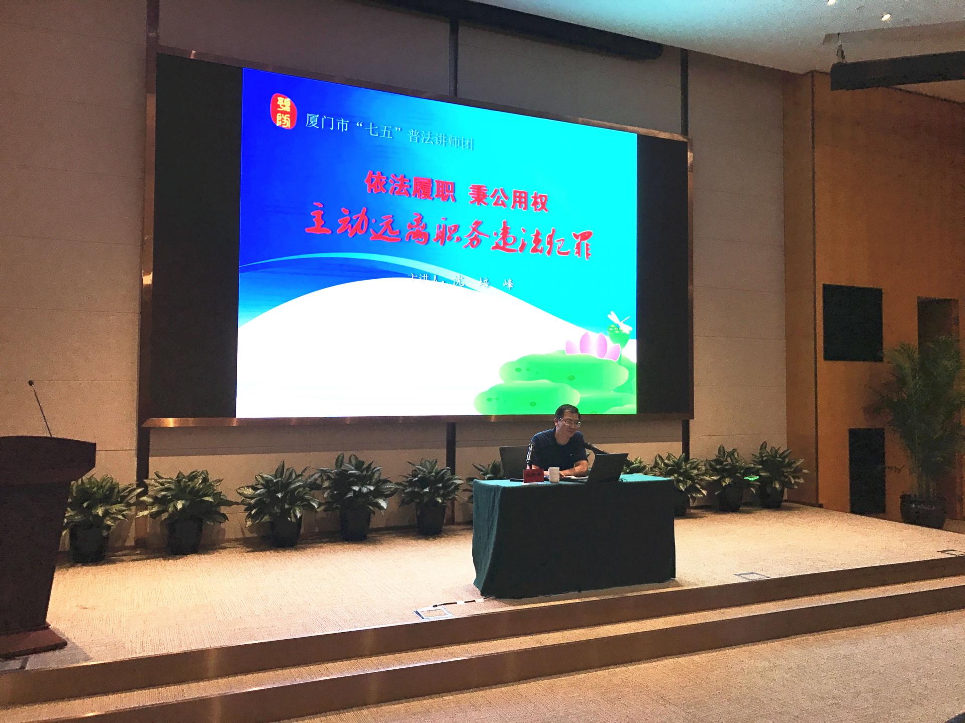 本次講座由廈門市紀(jì)委宣傳部副部長沈培峰主講,沈部長以“依法履職,秉公用權(quán)——主動(dòng)遠(yuǎn)離職務(wù)違法犯罪”為題,從反腐敗查辦案件基本情況、分領(lǐng)域政治精準(zhǔn)反腐啟示、職務(wù)違法犯罪的預(yù)防建議等方面,結(jié)合實(shí)際案例,對(duì)職務(wù)犯罪造成的危害進(jìn)行深刻剖析。沈部長認(rèn)為,遠(yuǎn)離職務(wù)犯罪要以案為鑒,謹(jǐn)記犯罪風(fēng)險(xiǎn);抓早抓小,注重防微杜漸;排查風(fēng)險(xiǎn),突出預(yù)防重點(diǎn)。